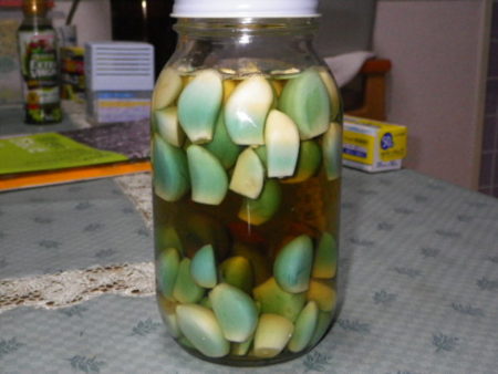 醸造酢が入った瓶にニンニクの皮をむいて一片ずつほぐして入れるだけです。上の写真のように、時間が経つにつれ、にんにくが青→緑→黄金色と変わっていくのが特徴です。