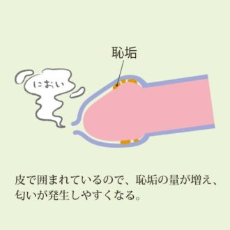 また、通称「チンカス」と呼ばれていて、雑菌のかたまりである「恥垢(ちこう)」がたまります。恥垢は感染症やペニスのガンを発生させやすくします。