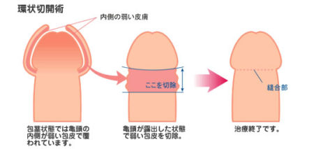 どちらでも、余分な皮膚や亀頭とくっついた皮膚を切る「環状切除術(かんじょうせつじょじゅつ)」「背面切開術(はいめんせっかいじゅつ)」と呼ばれる手術が行われます。
