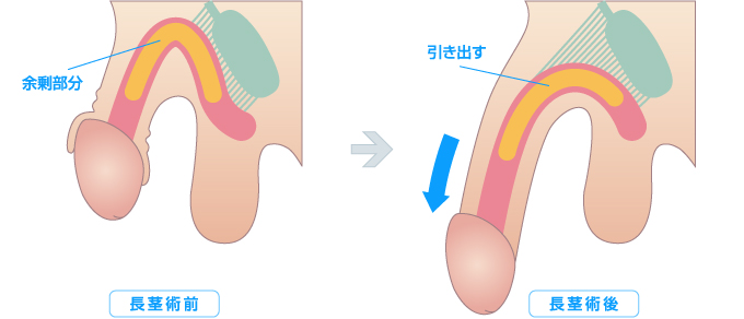 上のイラストのように、ペニスを長くする手術は体内に埋まっているペニスを引き出すという形をとります。