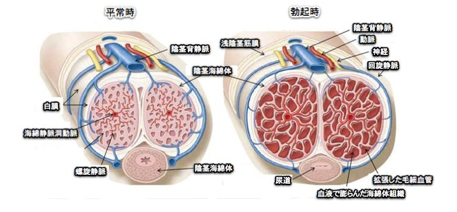 勃起は、上のイラストのようにペニスの中にある海綿体という場所に血液が流れ込み、たまることで起こります。水風船と似ています。そのため、ペニスに流れてたまる血液が多いほどペニスは大きくなります。そうするには、血液をサラサラにしたり、血管をやわらかく丈夫にしたりする必要があります。