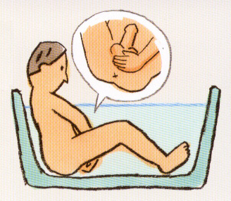 イラストのように肛門と玉袋の付け根に手をあててください。そこで、肛門を閉めてみてください。そうすると筋肉がピクピクと動くのが確認できると思います。そこが球海綿体筋です。