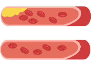 これらの毒素が上のイラストのように、血管の内側にくっついて血管を狭くします。これをプラークと呼びます。ぷろーくは血管を狭めるだけでなく、血管の栄養を奪い取って血管をボロボロにしてしまいます。